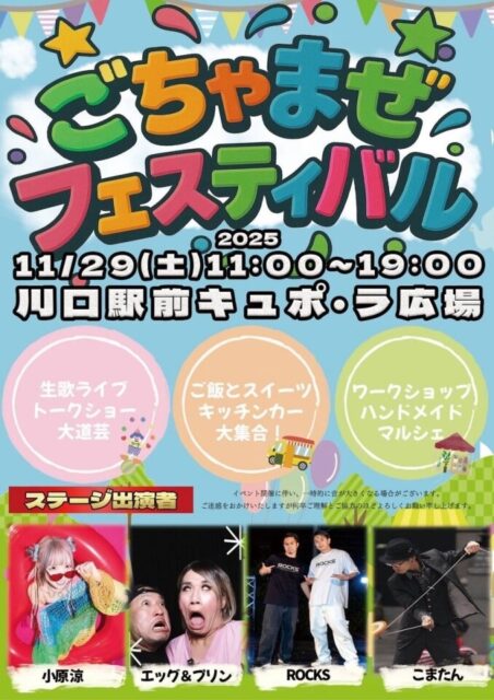 川口駅東口キュポ・ラ広場で開催されるごちゃまぜフェスティバルは、歌やトーク、大道芸が繰り広げられるステージを中心に、キッチンカーのグルメやスイーツ、ワークショップ、ハンドメイドマルシェなど多彩なコンテンツが広がるイベントです。家族で一日中楽しめるプログラムが盛り込まれ、会場には小原涼やエッグ&プリン、ROCKS、こまたんといった出演者が登場し、会場の盛り上がりをさらに引き立てます。
