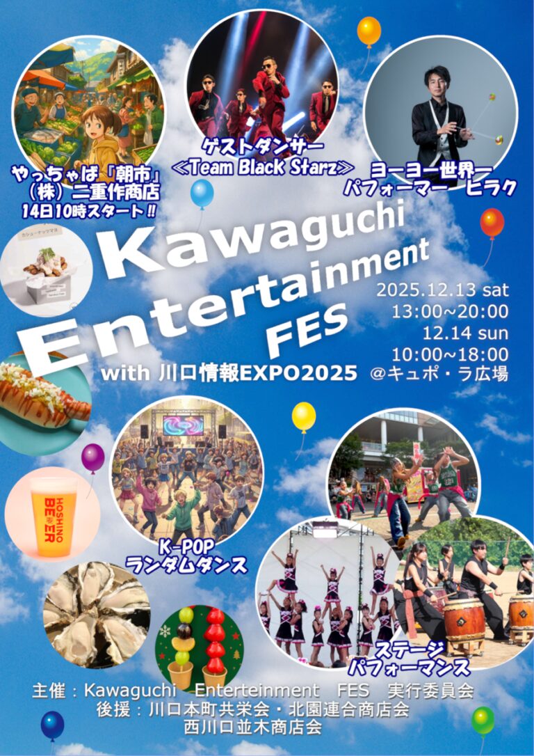 川口駅前のキュポ・ラ広場がエンターテイメント空間に変わり、音楽やダンス、フードが一度に楽しめる内容で盛り上がるイベントとして開催され、ゲストダンサーの登場やK-POPランダムダンス、和太鼓パフォーマンスなど多彩なステージが展開されるほか、キッチンカーや飲食テントも並び一日中楽しめるフェスとして注目が集まっている。
