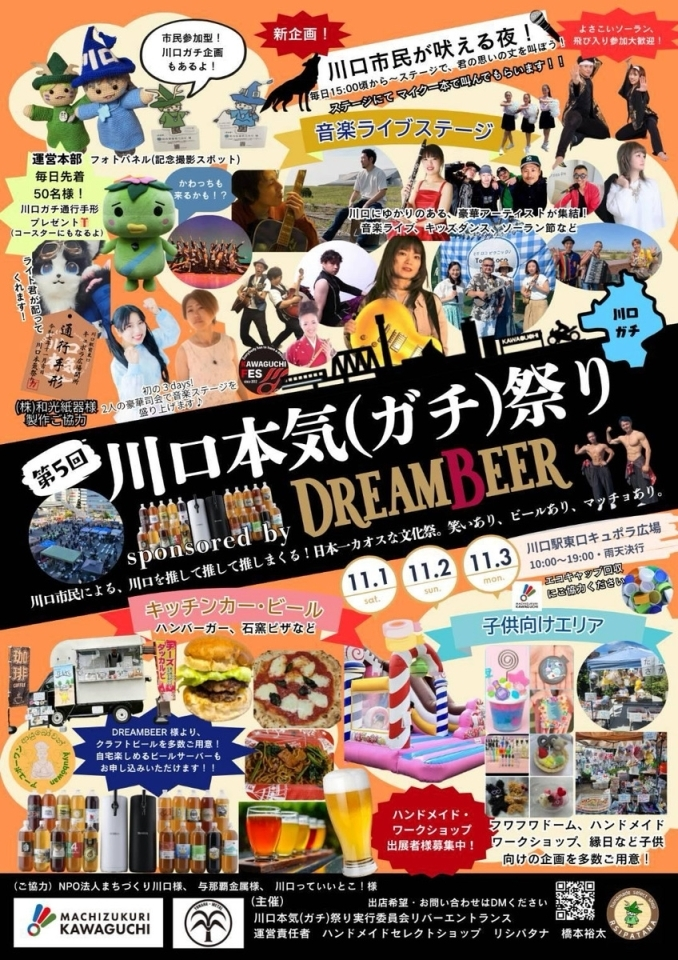 川口の街を本気で盛り上げる市民参加型フェス「川口本気(ガチ)祭り」が、今年もキュポ・ラ広場で開催!ダンスやバンド演奏、キッズチームのパフォーマンスなど、地元ゆかりのアーティストたちが登場する音楽ステージが連日開催されます。クラフトビールや地元グルメが味わえるキッチンカー、ふわふわドームや縁日などの子ども向けエリアも登場。世代を問わず楽しめる秋の大イベントです。